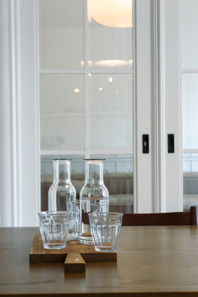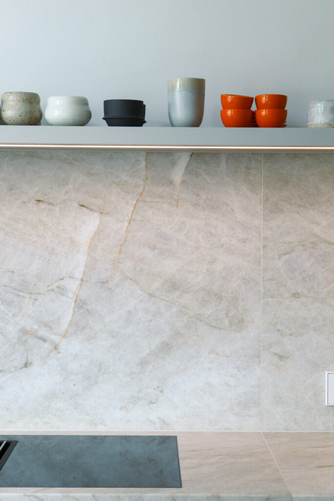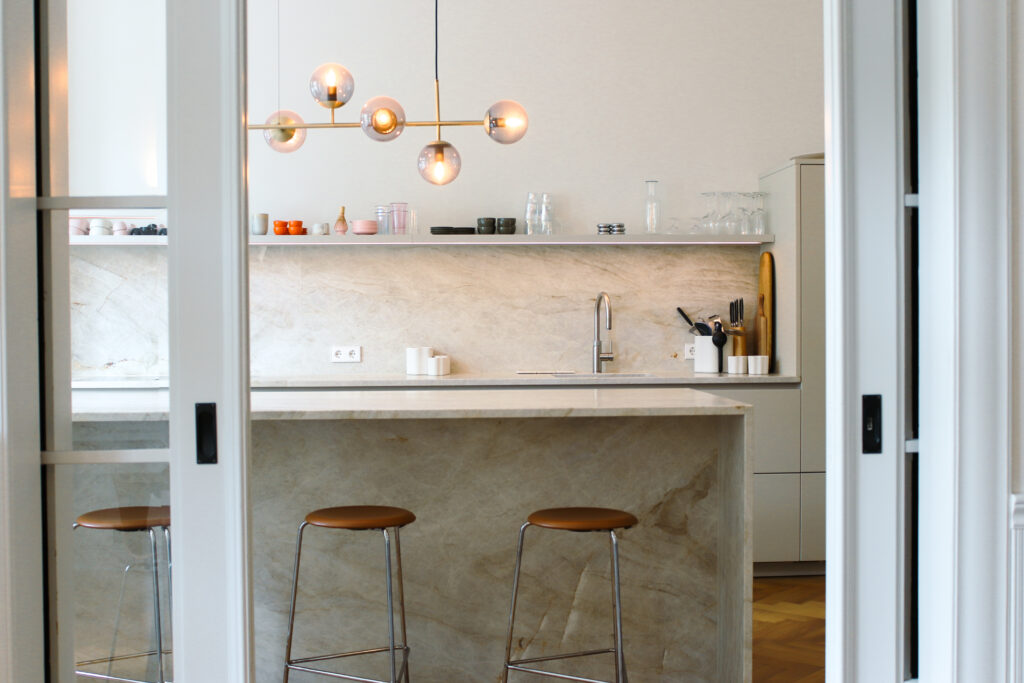 Der neu organisierte Grundriss stellt die Küche in den Mittelpunkt des Familienlebens. Taupefarbene Fronten, eine großzügige Insel und Arbeitsflächen aus Naturstein schaffen einen offenen Raum, der gleichermaßen für Alltag und gemeinsames Kochen funktioniert. Anstelle des ehemaligen Gäste-WCs entstand für die Kinder ein eigenes Duschbad, das den Alltag deutlich erleichtert.