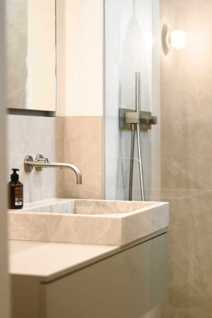 Auch die Bäder wurden vollständig neu gedacht: sandige Töne, mattgoldene Armaturen und maßgefertigte italienische Waschbecken fügen sich zu einem ausgewogenen, eleganten Ensemble. Maßgeschneiderte Einbauten bieten Stauraum und integrieren sich selbstverständlich in das Gestaltungskonzept.