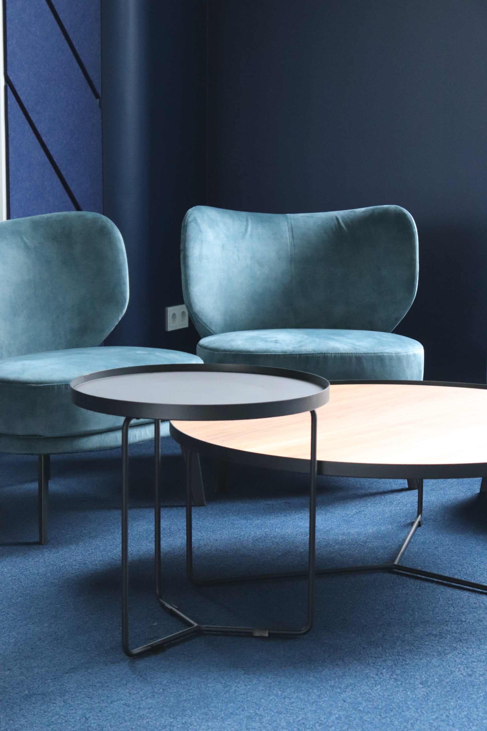 Die Farbpalette wurde sorgfältig auf die Unternehmensidentität abgestimmt: Verschiedene Nuancen von Blau dienen als ruhiger, konzentrierter Grundton, der den kreativen Arbeitsprozess unterstützt. Diese werden durch gelbe Akzentfarbenergänzt, die Energie und visuelle Spannung erzeugen und so die Dynamik des Studios widerspiegeln, ohne den Arbeitsfluss zu stören. Die Akustikmodule aus hochwertigen Materialien adressieren die akustischen Anforderungen des Studios und sorgen dafür, dass der Raum sowohl Ruhe als auch offene Kommunikation ermöglicht. Dadurch entsteht eine angenehme Arbeitsatmosphäre, die den hohen Anforderungen an die Funktionalität gerecht wird.